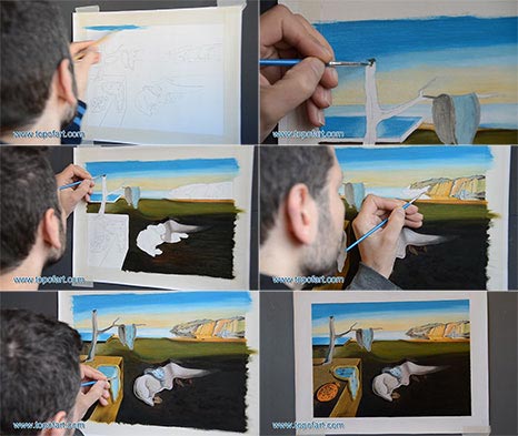 Watch a video showcasing the creation of a hand-painted reproduction of The Persistence of Memory by Dali in our TOPofART studio. Witness the step-by-step process as our artists bring this masterpiece to life.