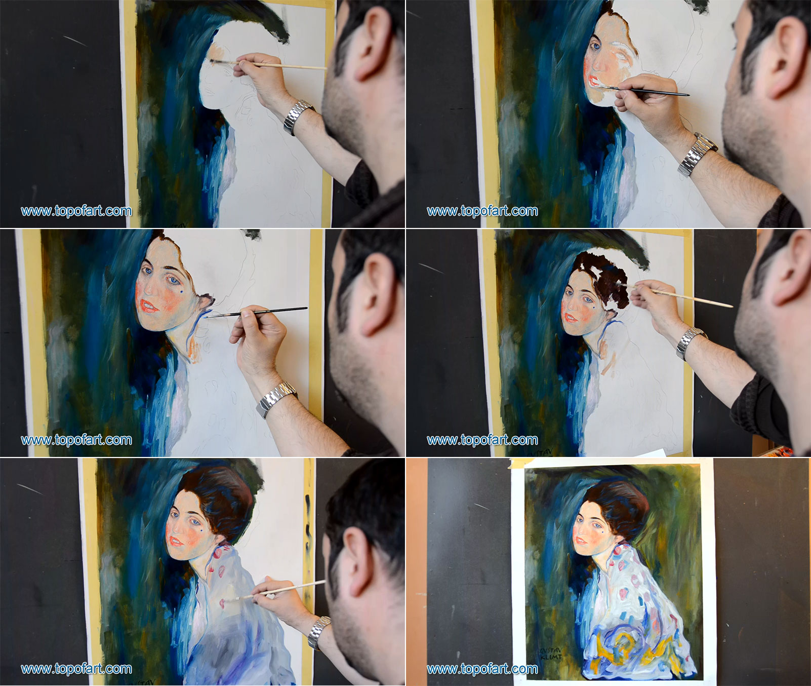 Watch a video showcasing the creation of a hand-painted reproduction of Portrait of a Young Woman by Klimt in our TOPofART studio. Witness the step-by-step process as our artists bring this masterpiece to life.