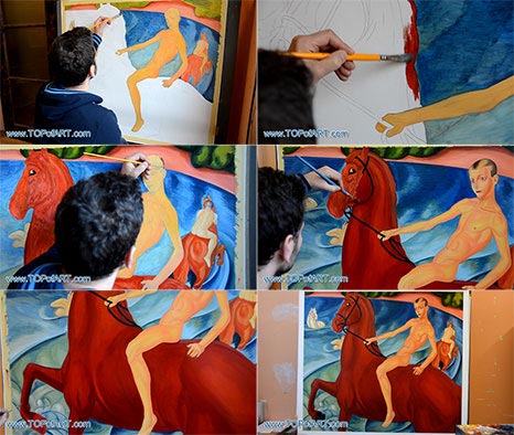 Watch a video showcasing the creation of a hand-painted reproduction of Bathing of the Red Horse by Kuzma Petrov-Vodkin in our TOPofART studio. Witness the step-by-step process as our artists bring this masterpiece to life.