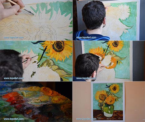Watch a video showcasing the creation of a hand-painted reproduction of Three Sunflowers in a Vase by Vincent van Gogh in our TOPofART studio. Witness the step-by-step process as our artists bring this masterpiece to life.