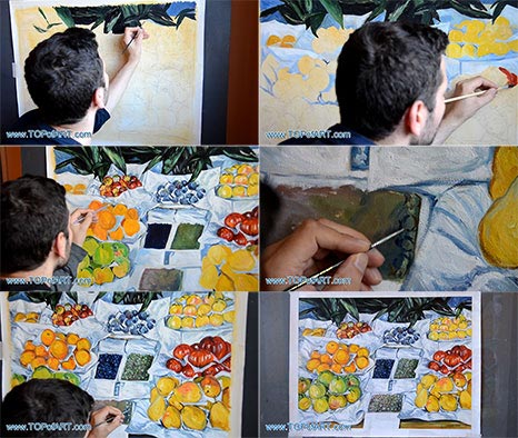 Watch a video showcasing the creation of a hand-painted reproduction of Fruit Displayed on a Stand by Caillebotte in our TOPofART studio. Witness the step-by-step process as our artists bring this masterpiece to life.