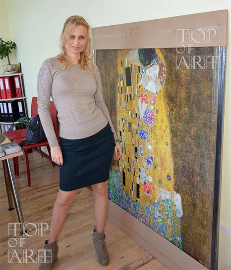 Watch a video showcasing the creation of a hand-painted reproduction of The Kiss by Klimt in our TOPofART studio. Witness the step-by-step process as our artists bring this masterpiece to life.