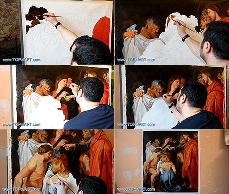 Watch a video showcasing the creation of a hand-painted reproduction of Raising of Lazarus by Rubens in our TOPofART studio. Witness the step-by-step process as our artists bring this masterpiece to life.