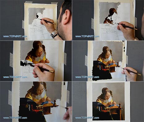 Watch a video showcasing the creation of a hand-painted reproduction of The Lacemaker by Vermeer in our TOPofART studio. Witness the step-by-step process as our artists bring this masterpiece to life.