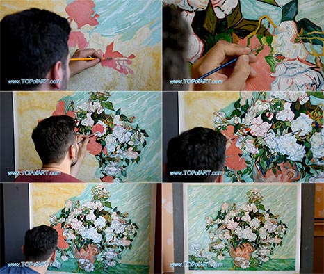 Watch a video showcasing the creation of a hand-painted reproduction of Roses by Vincent van Gogh in our TOPofART studio. Witness the step-by-step process as our artists bring this masterpiece to life.