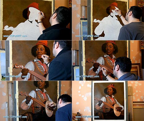 Watch a video showcasing the creation of a hand-painted reproduction of The Banjo Player by William Sidney Mount in our TOPofART studio. Witness the step-by-step process as our artists bring this masterpiece to life.